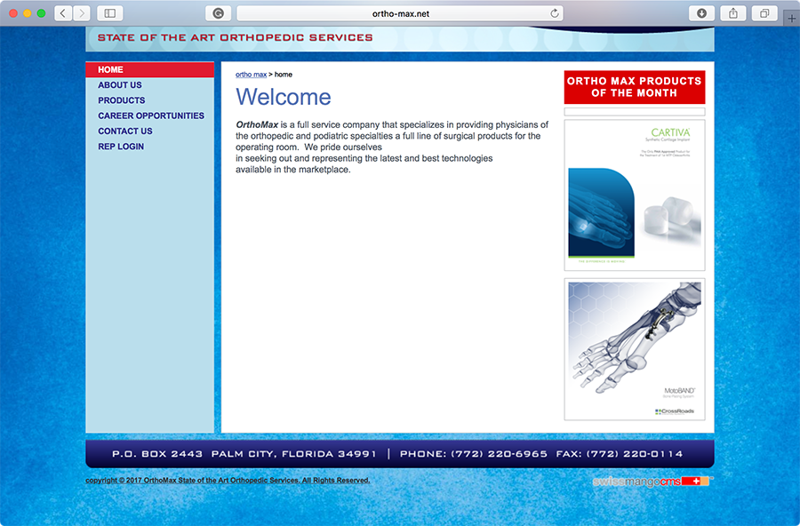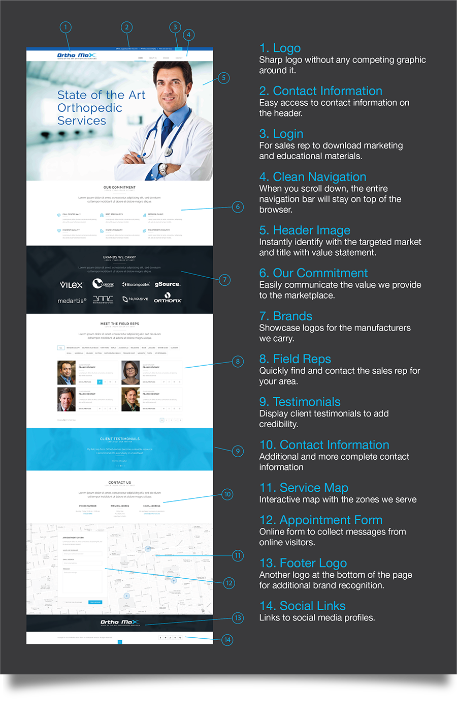 FIRST: Their business is as good as the brands they represent and carry. Luckily for us, Ortho Max already represented some of the best-known brands for orthopedic and podiatric physicians. That is why I made sure those logos were clearly showcased on the homepage. I even did it in reverse to make sure the contrast stand out from the rest of the page.