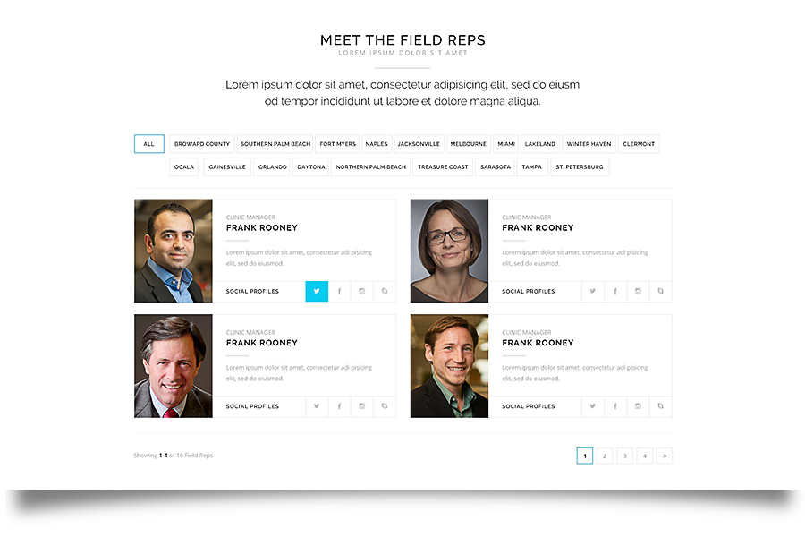 SECOND: For doctors to buy, they must do it thru a sales rep. And reps were divided by region. Because of that, I showcased the sales team right on the homepage. To make it easier to find the sales rep for the area of the doctor, I added a filter by County. Also, each Sales Rep had the links for their respective social profiles, making it even easier to find the sales rep for the regions and the prefer method of contact.
